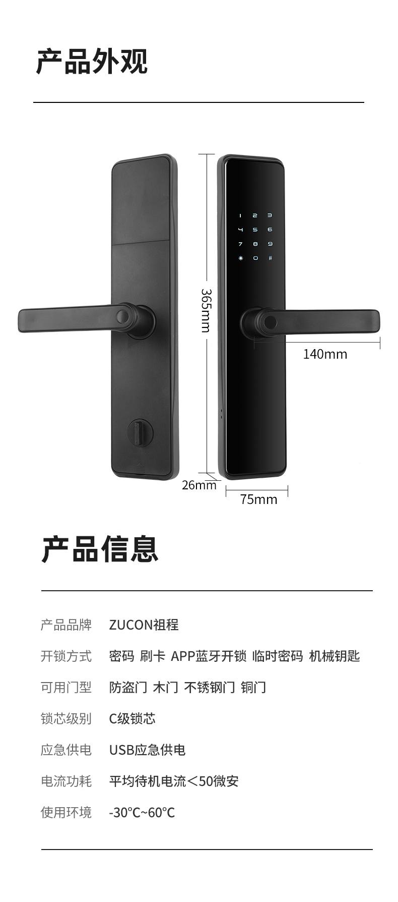 ZUCON祖程G1公寓密碼鎖防盜門電子智能門鎖家用刷卡臨時密碼限時限次
