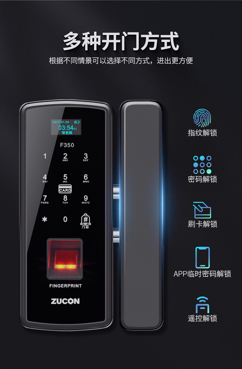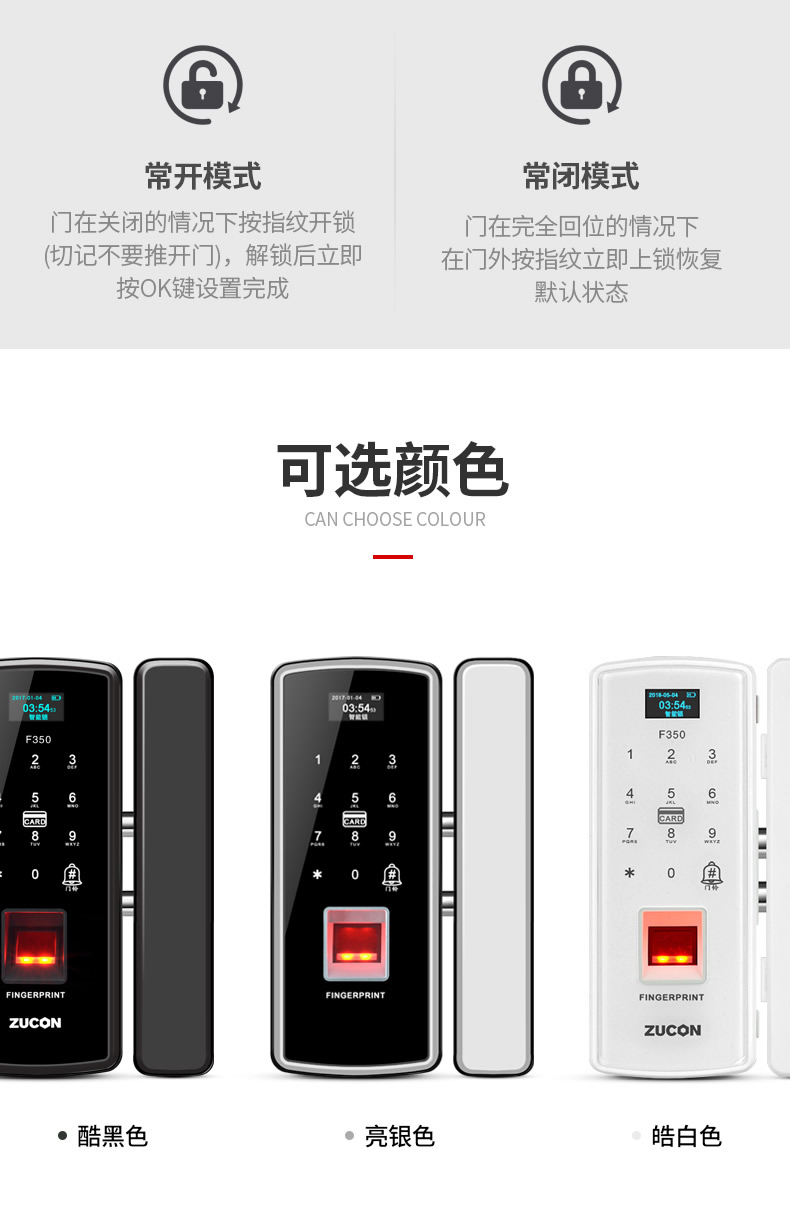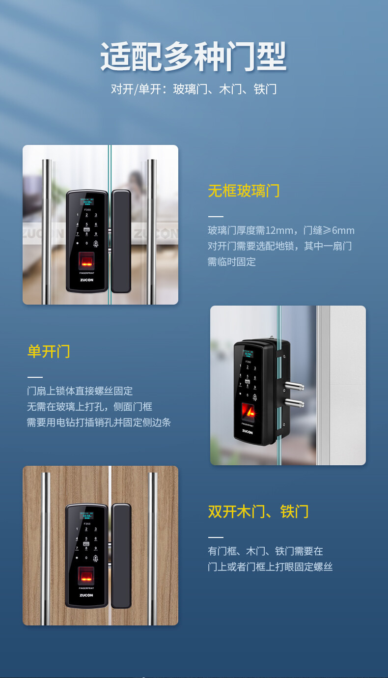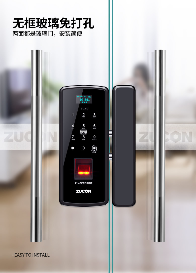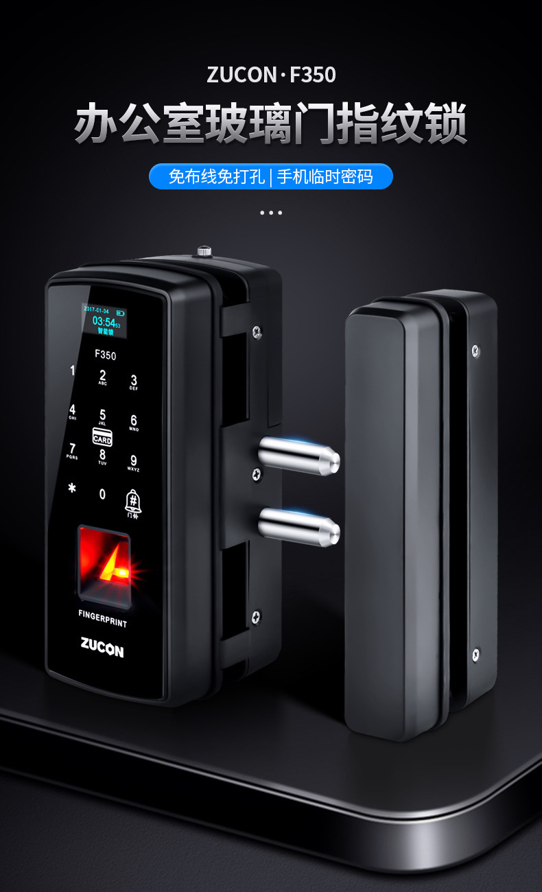 ZUCON祖程F350玻璃門指紋鎖免開(kāi)孔辦公室密碼鎖商鋪門鎖雙門有框智能電子門禁鎖