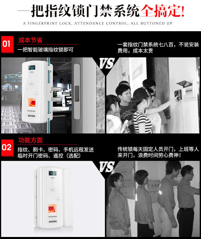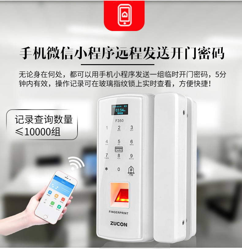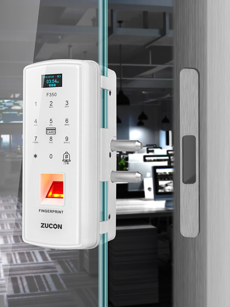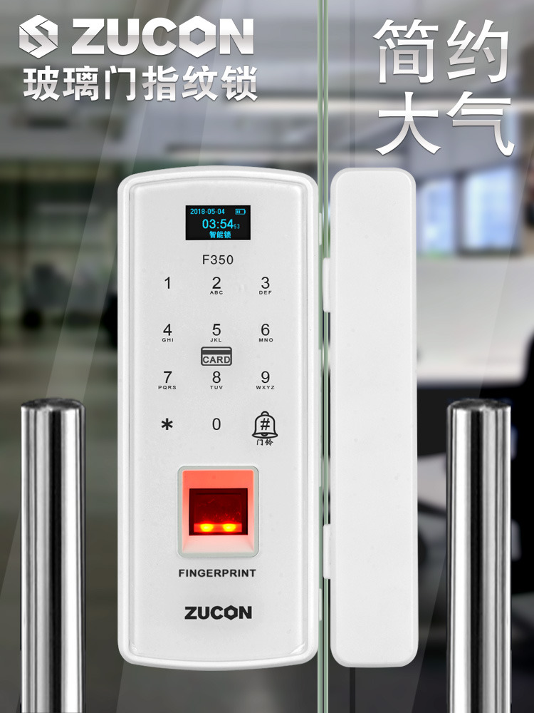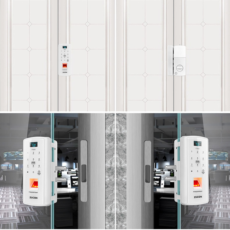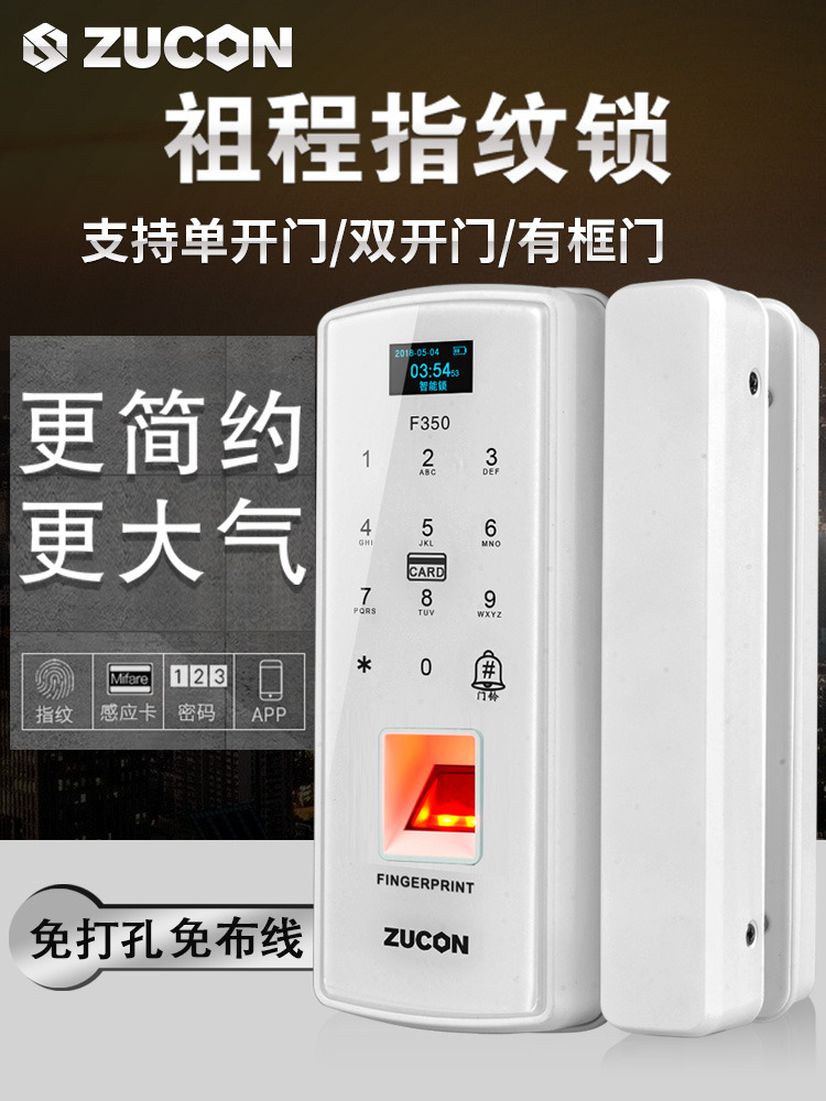 ZUCON祖程F350白色 辦公室玻璃門指紋鎖一體機免開孔門禁系統(tǒng)雙門電子鎖密碼鎖