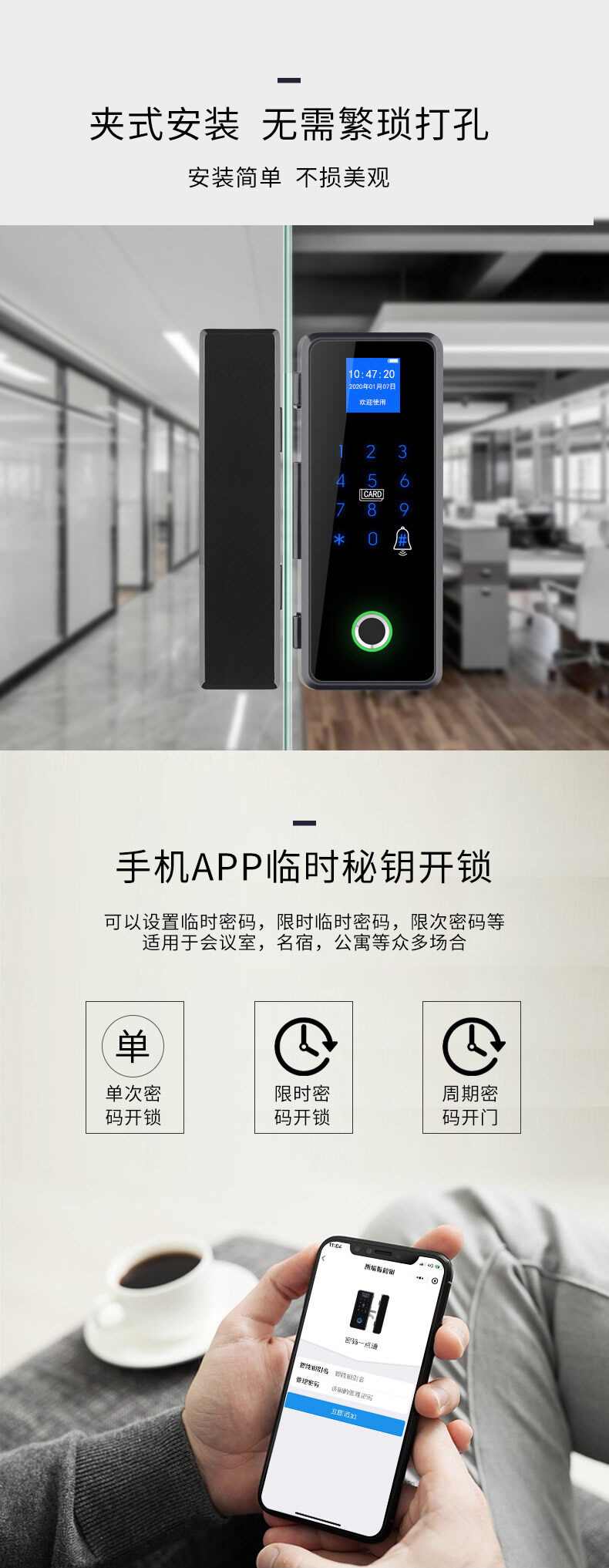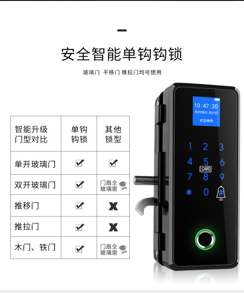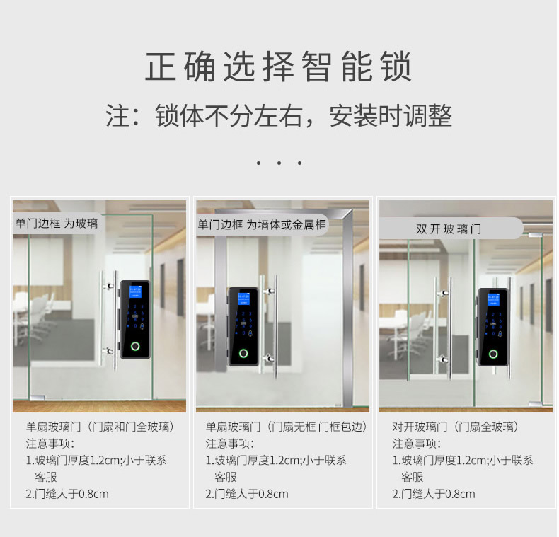 ZUCON祖程F453玻璃門指紋鎖免開孔帶鉤鎖辦公電子密碼鎖單雙門免地銷
