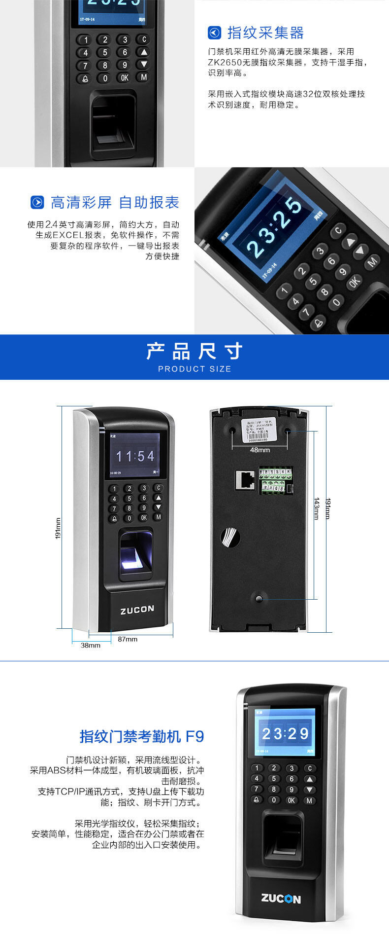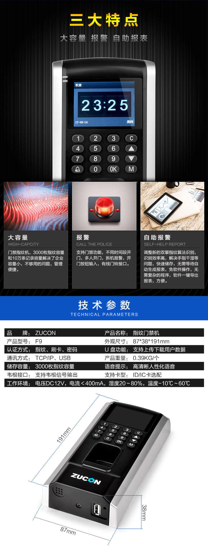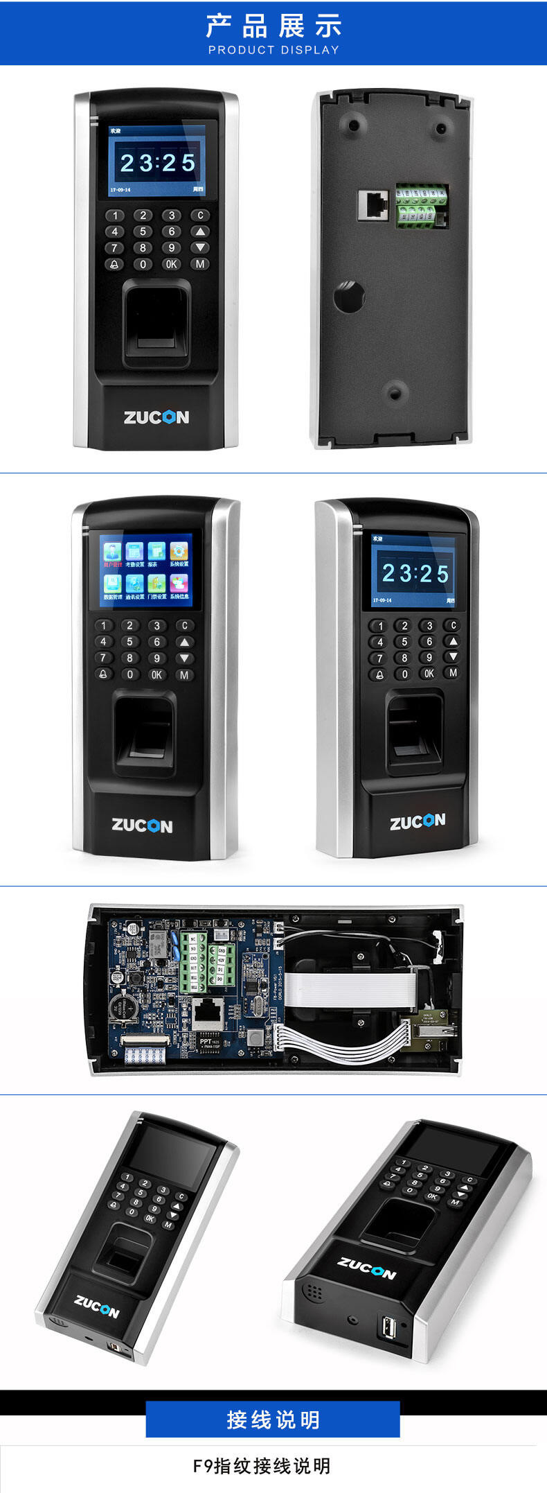 ZUCON祖程F9指紋刷卡密碼門禁考勤主機(jī)網(wǎng)絡(luò)U盤下載數(shù)據(jù)3000大容量